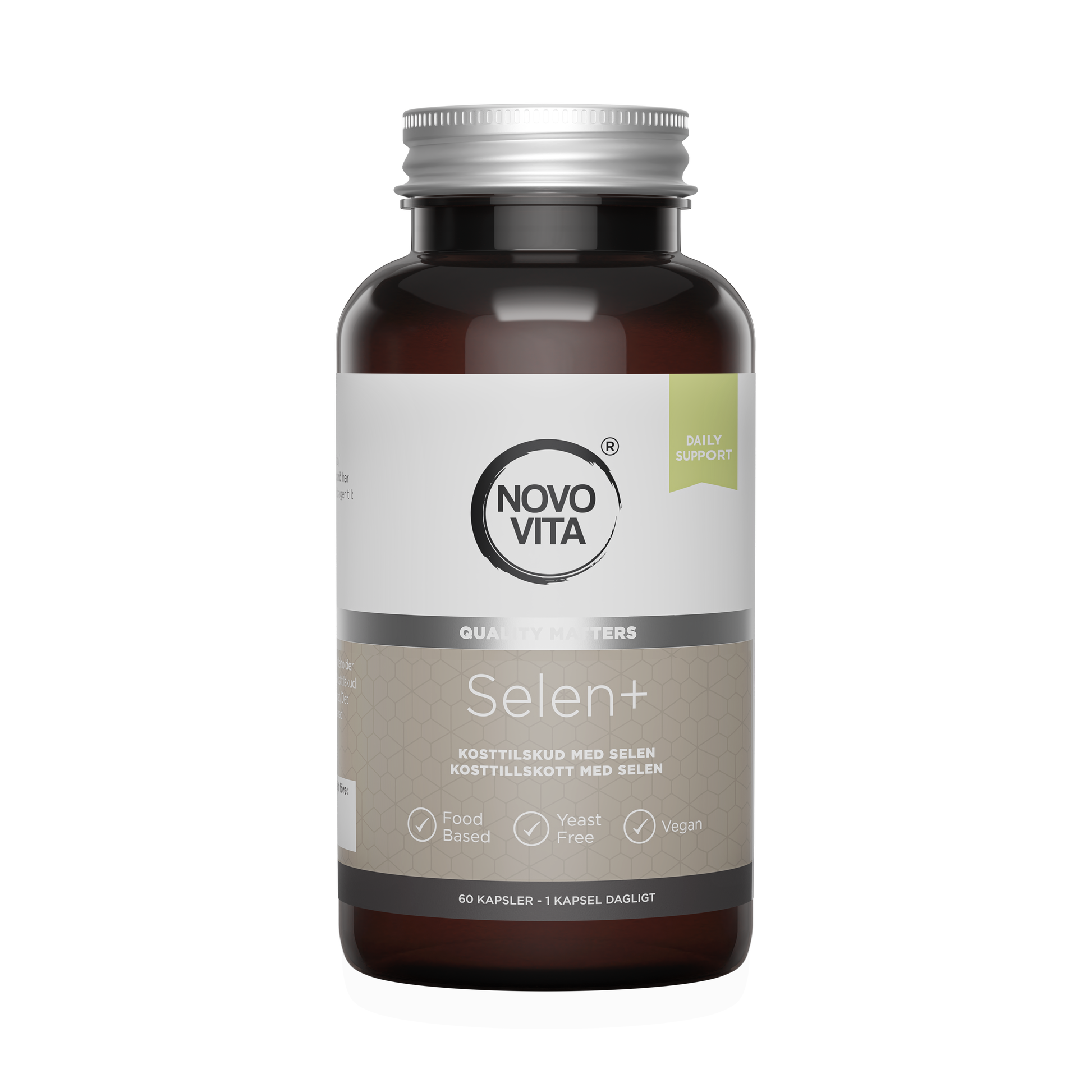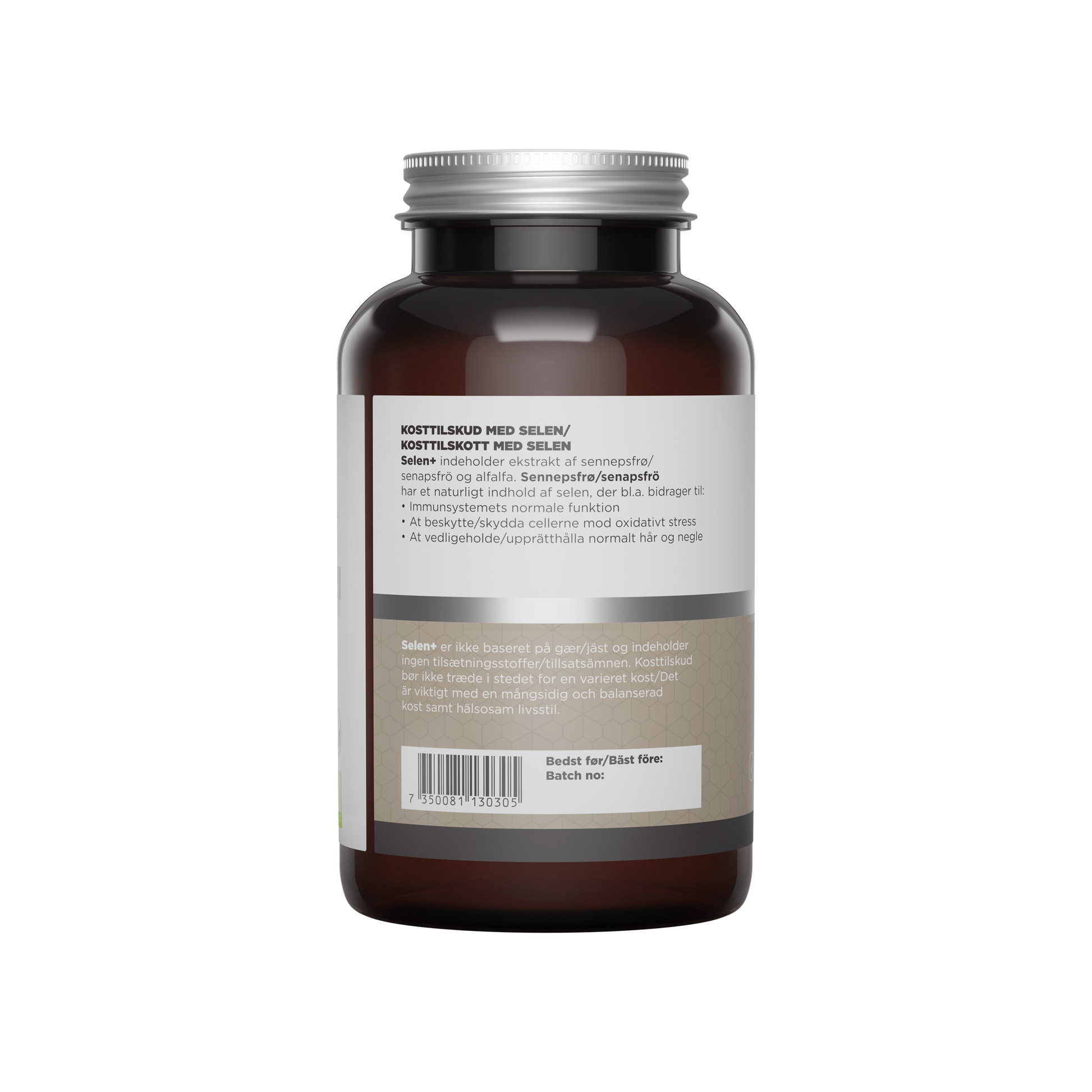 Selen+ indeholder selen udvundet af plantebaserede kilder (sennepsfrø og alfalfa) samt silicium i vegetabilske kapsler. Ekstraktet fremstilles via en patenteret vandbaseret proces – uden brug af gær eller unødige tilsætningsstoffer.